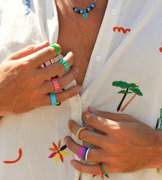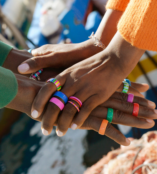 Handmade rings and ring stacks in 18k gold-plated sterling silver and enamel, designed to be worn solo or stacked.